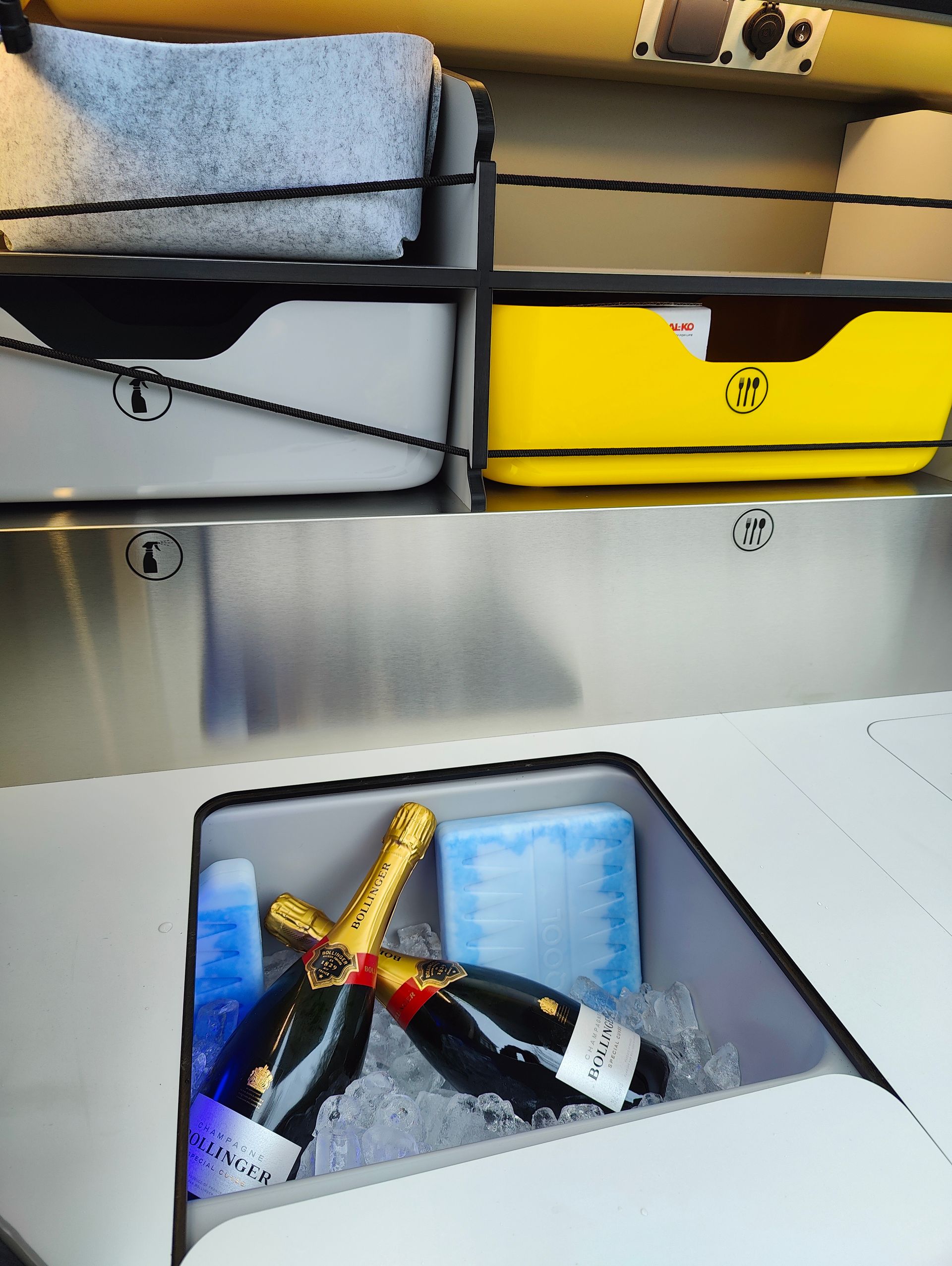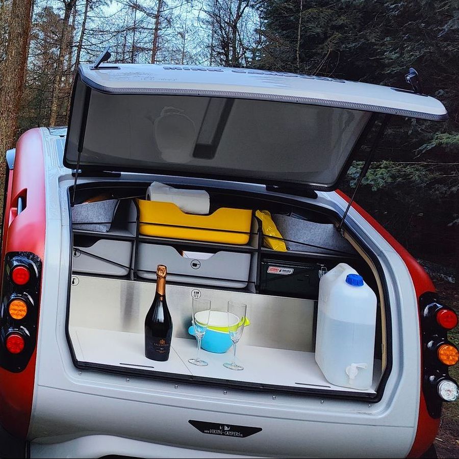 Wanneer je de achterkant van de MINK 2.0 Sportscamper opent, wordt een goed georganiseerde en prachtig verlichte keuken onthuld. Deze slim ontworpen ruimte biedt alle benodigdheden voor een heerlijke kookervaring in de buitenlucht. Het royale aanrechtblad herbergt een ingebouwde koelbox om je etenswaren fris te houden. Bovendien vind je zowel een 12V-aansluiting voor kleine apparaten als een 220V-aansluiting die beschikbaar is wanneer de MINK is aangesloten op elektriciteit.